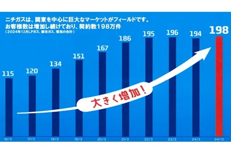 当社は関東圏を中心に200万戸を超えるお客様に契約を頂いており、ガス(LPガス、都市ガス)、電気の供給、ガス機器や住宅機器の販売、住宅設備機器のリフォーム、を行っており、料金の安さと細やかなサービスを強いにシェアを伸ばし続けています。