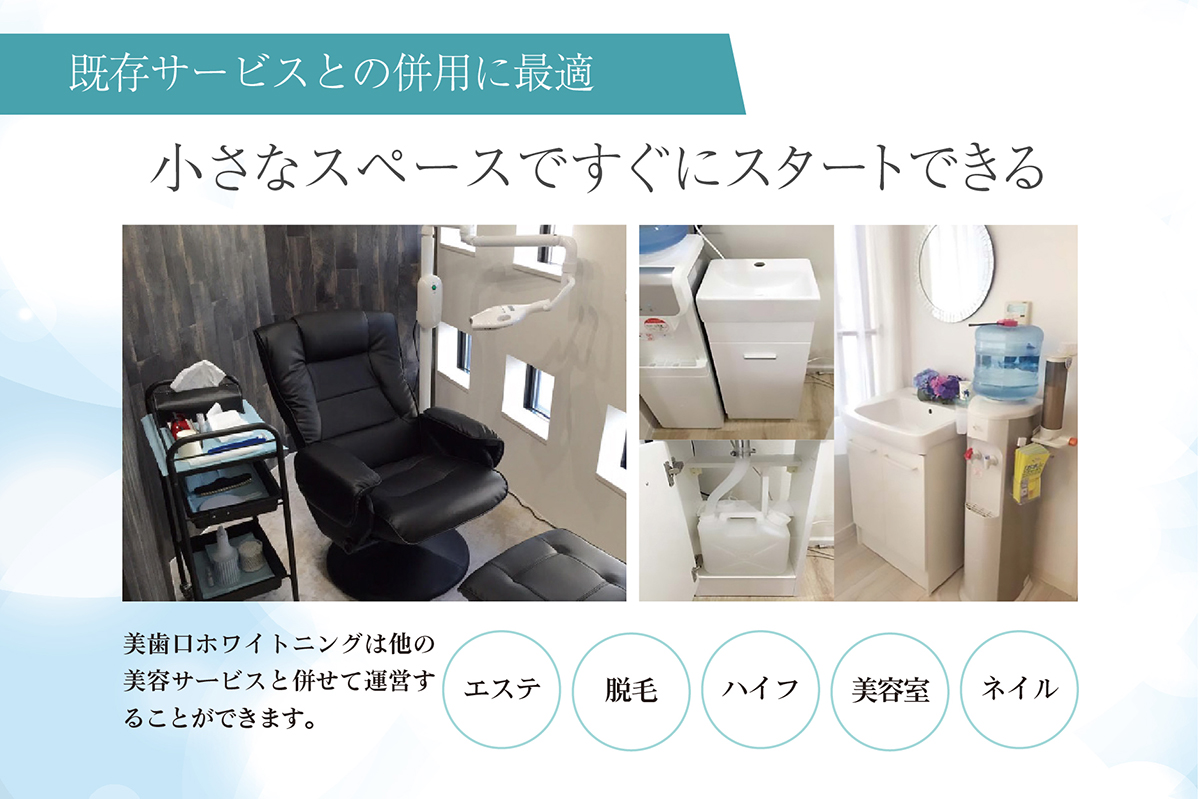 美歯口ホワイトニングは、店舗やオフィスなどの空きスペースを活用して導入できるセルフホワイトニングサービスです。